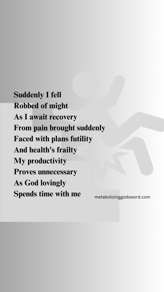 Suddenly I fell Robbed of might As I await recovery From pain brought suddenly Faced with plans futility And health’s frailty My productivity Proves unnecessary As God lovingly Spends time with me